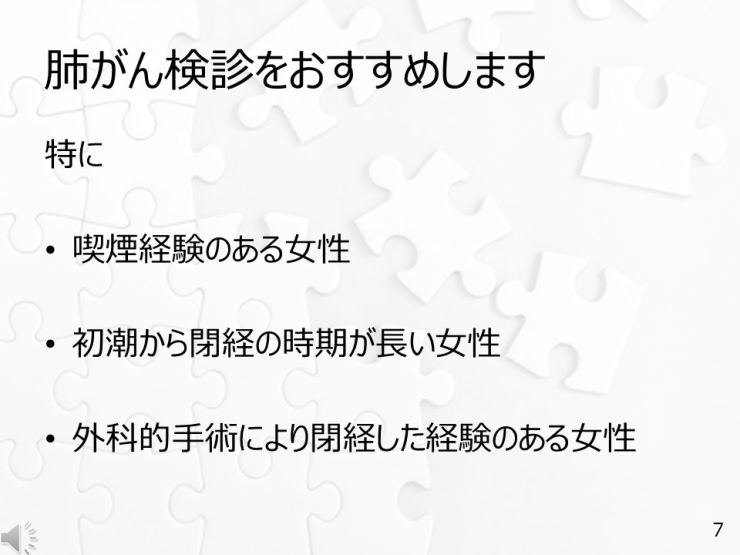 喫煙をしている女性はもちろんのこと、タバコを吸ったことのない女性でも、初潮から閉経の時期が長い(36年以上)、あるいは外科的手術により閉経した経験のある方は、一度はぜひ「肺がん検診」を受けることを推奨します。