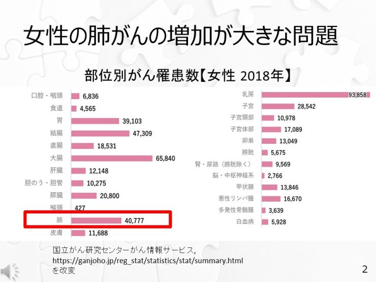 2018年の女性の新規肺がん罹患者は約4万人。死亡者数も急増していて、同年は約2万2000人が肺がんによって亡くなりました。日本人が一生のうちにがんと診断される確率は、国立がん研究センターの2018年の統計データによると、男性が65%、女性が50%で、がんで死亡する確率は、2020年の統計データによると、男性が27%、女性が18%でした。臓器別では、男性が①前立腺がん、②大腸がん、③胃がん、④肺がんの順に、女性が①乳がん、②大腸がん、③肺がん、④胃がんの順に罹りやすく、死因としては、男性が①肺がん、②胃がん、③大腸がん、④すい臓がん、女性が①大腸がん、②肺がん、③膵臓がん、④乳がんの順に多い結果でした。最近は女性の肺がんの増加が日本人全体の肺がん死亡者数増加の大きな要因となっています。