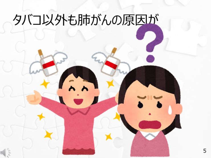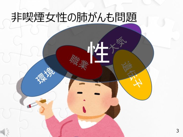 肺がんの一番の原因は「喫煙」であることは言うまでもありませんが、非喫煙者の肺がんが現在注目を集めており、環境、職業、大気、遺伝子、性が検討されています。非喫煙者の肺がんは現在、がん死の第7の原因で、世界で肺がん患者の25%が非喫煙者と推定されています。