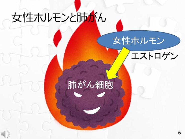 最近の研究では、女性ホルモンが肺がんに関係することが指摘されています。女性ホルモンであるエストロゲンは、肺のがん細胞の増殖を直接促進したり、肺がん細胞中にあるエストロゲン受容体に、エストロゲンがくっつくことによってがん化を促進したりすることにより、肺がんの発生にかかわると考えられています。2022年国立がん研究センターは、女性非喫煙者の肺がんは、女性ホルモンのエストロゲンが関係している可能性があるという研究結果を発表しました。40~69歳のたばこを吸ったことがない約4万2000人の女性を21年間追跡した結果、400人が肺がんに罹患し、うち305人が腺がんでした。閉経が早い女性(47歳以下)に比べて、遅い女性(51歳以上)の方が肺腺がんのリスクが1.41倍高く、初潮から閉経までの期間が短い女性(32年以下)と比べて、長い女性(36年以上)の方が肺腺がんのリスクが1.48倍高いという結果でした。正常な肺や肺がんの組織には、エストロゲンが結合する「エストロゲン受容体」があることから、肺がんの発生にはエストロゲンが関係していると考えられています。初経から閉経までの期間が長い場合、高濃度のエストロゲンに長期間さらされるため、それが肺がんリスクの上昇に関連した可能性があります。卵巣を摘出するなど外科的処置によって閉経した女性は、2.75倍も腺がんのリスクが上がったという研究報告もあります。外科的処置によって閉経したことで、急激にホルモンの変化が起こった可能性や、術後のホルモン剤の服用などがリスクを上げている可能性があります。