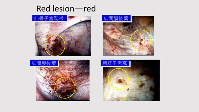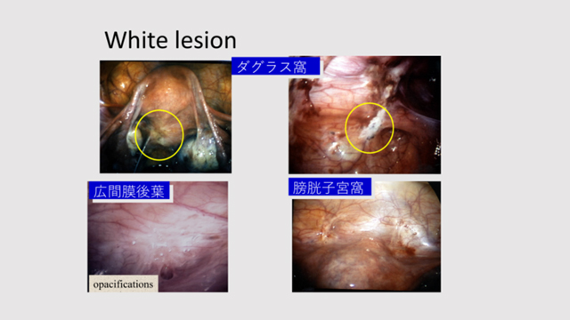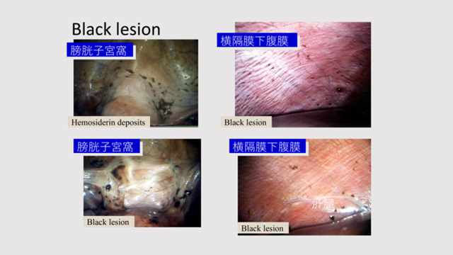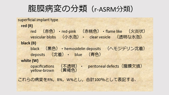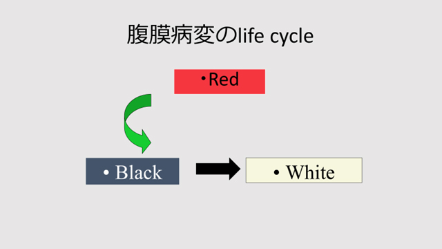 子宮内膜は月経周期によって変化します。上記の場合、横隔膜や臓側胸膜に子宮内膜組織が存在し、性周期に依存して増殖、出血、脱落、消退を繰り返します。青紫色結節、無色の嚢胞、白色プラーク、点状出血点、黒色点、小孔など多彩な形状を呈します。Re-AFS(米国不妊学会)分類のRe-ASRM分類という方法があり、腹膜(表在性)病変を色調と形態により大きく3パターン(Red・Black・White)に分類しています。横隔膜病変も腹膜病変同様に3パターンに分類することができ、月経周期の時間的推移によって、Blackの時期に穴が開いて、気胸を発症するのではないかと私は考えています。さらに、たまたま手術時、月経周期による変化のWhiteの時期にあたって、手術中の肉眼所見、さらには切除標本の病理組織学所見にも確定診断が得られないことが多いのではないかと考えています。
