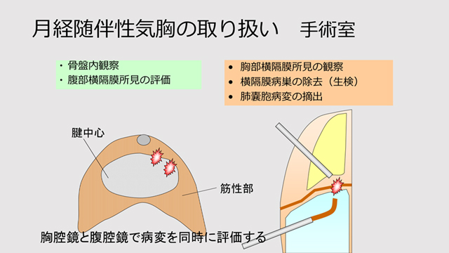 診断は臨床的に行われますが、確定診断は腹腔内・骨盤内の病変が腹腔鏡で行われるように、胸腔内も胸腔鏡で行う以外に有力な方法はありません。月経随伴性気胸では骨盤子宮内膜症の合併が40%程度ありますので、婦人科的検査は重要であり、その場合は腹腔鏡検査が有用です。私たちは以前、順天堂大学医学部呼吸器外科・産婦人科の共同臨床研究「月経随伴性気胸周術期管理Protocol study」を行いました。難治性の気胸患者さんに説明と同意を得て、全身麻酔下砕石位で胸腔鏡と腹腔鏡を同時に施行し、骨盤内・胸腹部横隔膜の徹底観察と病巣摘出を行いました。14例の患者さん(18~50歳;平均43.4歳、右側12例・左側2例)に実施しました。結果は、全例腹腔鏡または胸腔鏡で子宮内膜症と診断でき、横隔膜に所見があって横隔膜切除を行ったのは12例、うち10例に病理組織学的に子宮内膜組織の存在を証明できました。診断率100%と診断率が著明に向上しました。臓側胸膜に所見のあった例はありませんでした。