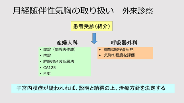 ライフスタイルの変化に伴い子宮内膜症は増えています。横隔膜病変も腹膜病変同様月経周期によって変化し、変化の途中で穴が開くと考えられるので、 病変の変化による見落としに注意が必要です。子宮内膜組織は月経周期によって退縮してしまうため、組織学的に確定診断が難しいのが厄介な点です。正確な診断に基づき患者さんにあった治療を選択することが重要ですので、呼吸器外科と婦人科とが協力して診療する体制が必要です。さらにホルモン療法を工夫することが再発防止に必要不可欠ですので、医師の経験と専門的知識が要求されます。病院を受診する際には、以上のことを参考に選択されるとよいと思います。